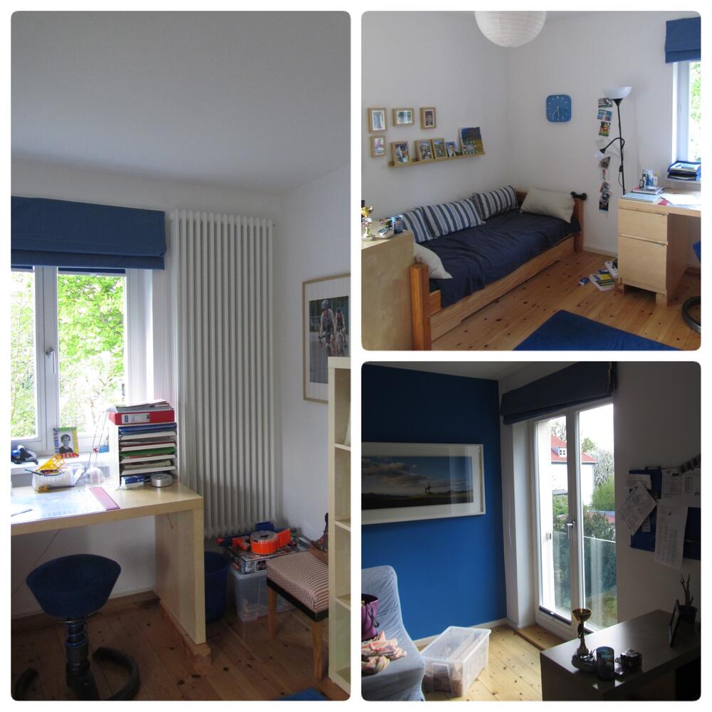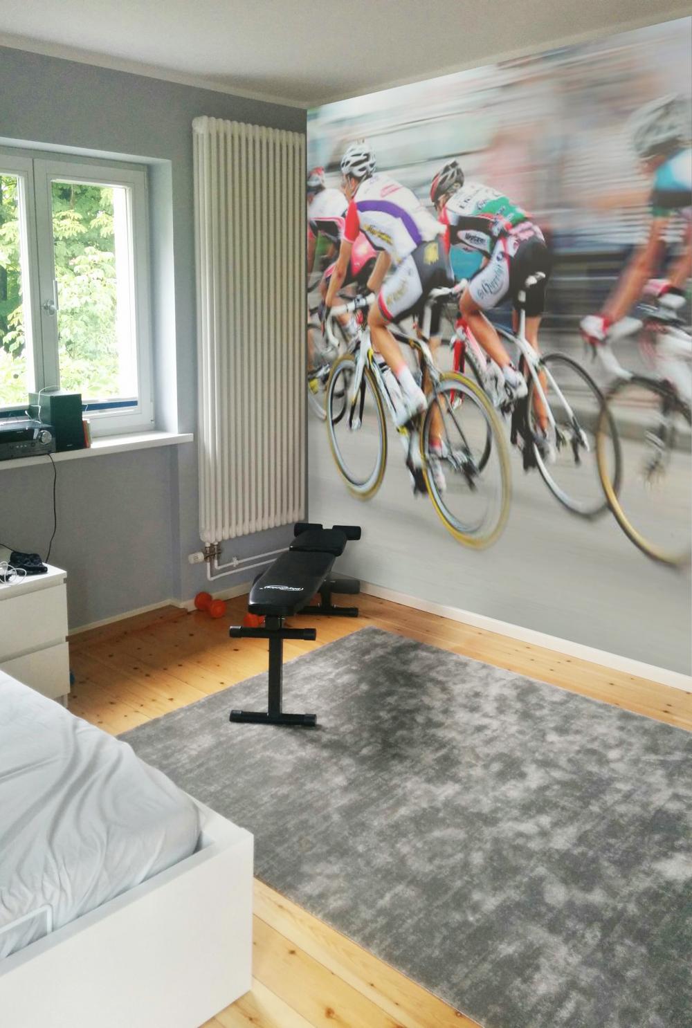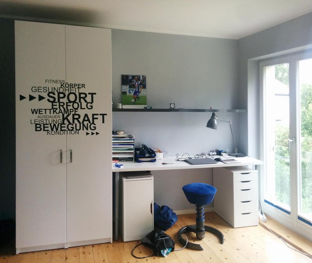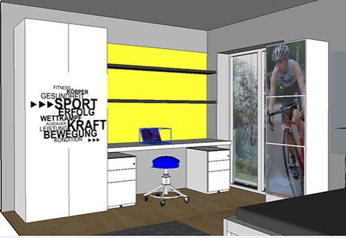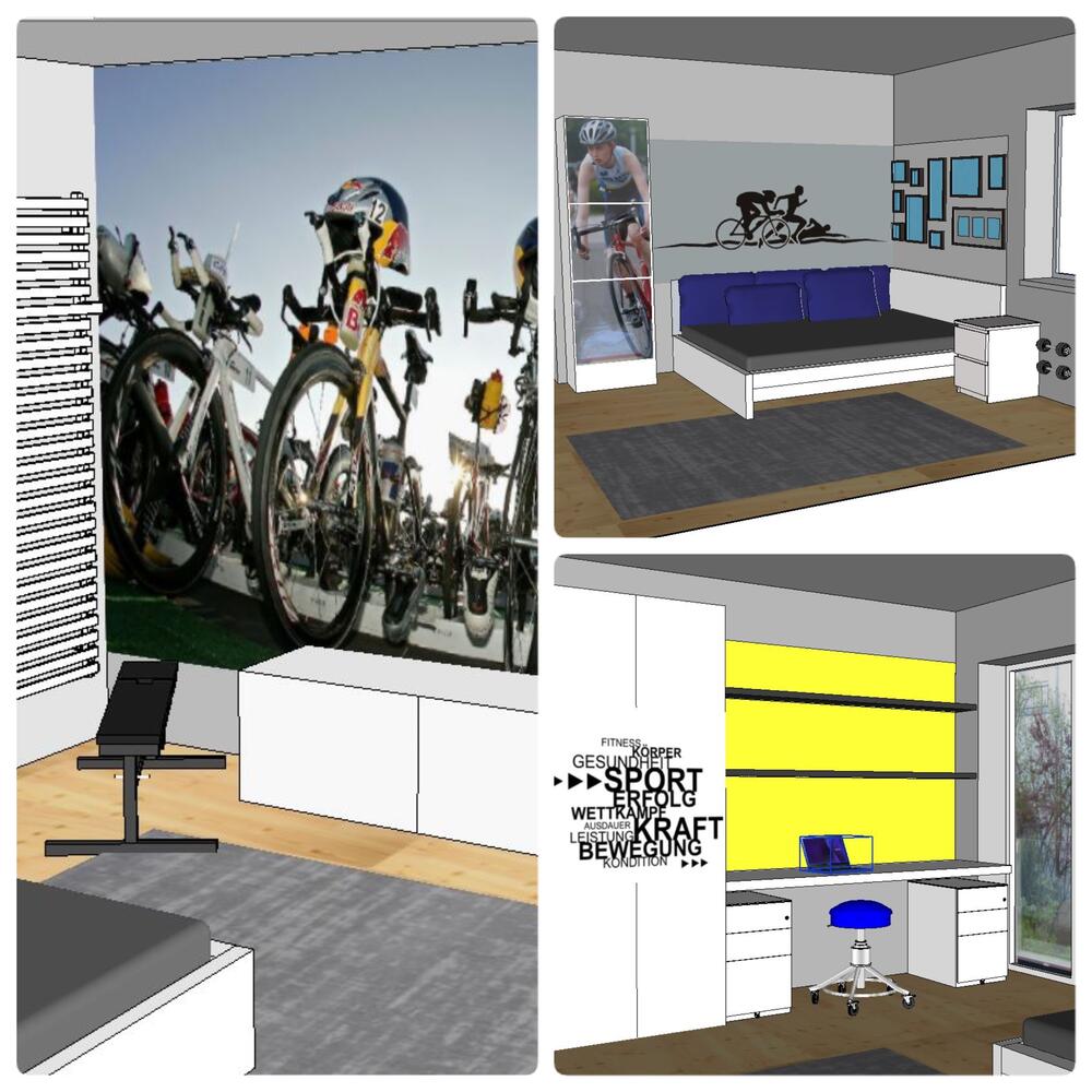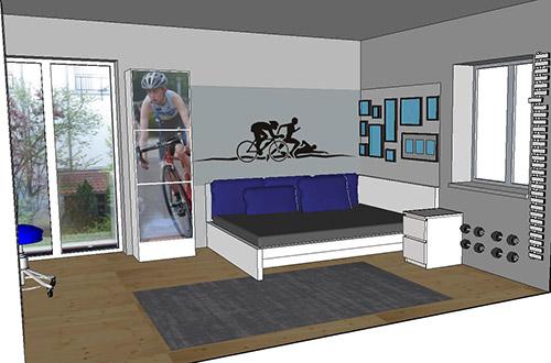 die bestehenden Möblierung wird durch ein großes Bett ergänzt und das Interesse für den Leistungssport wird im dekorativen Bereich mittels Wandtattoos und Tapete umgesetzt.