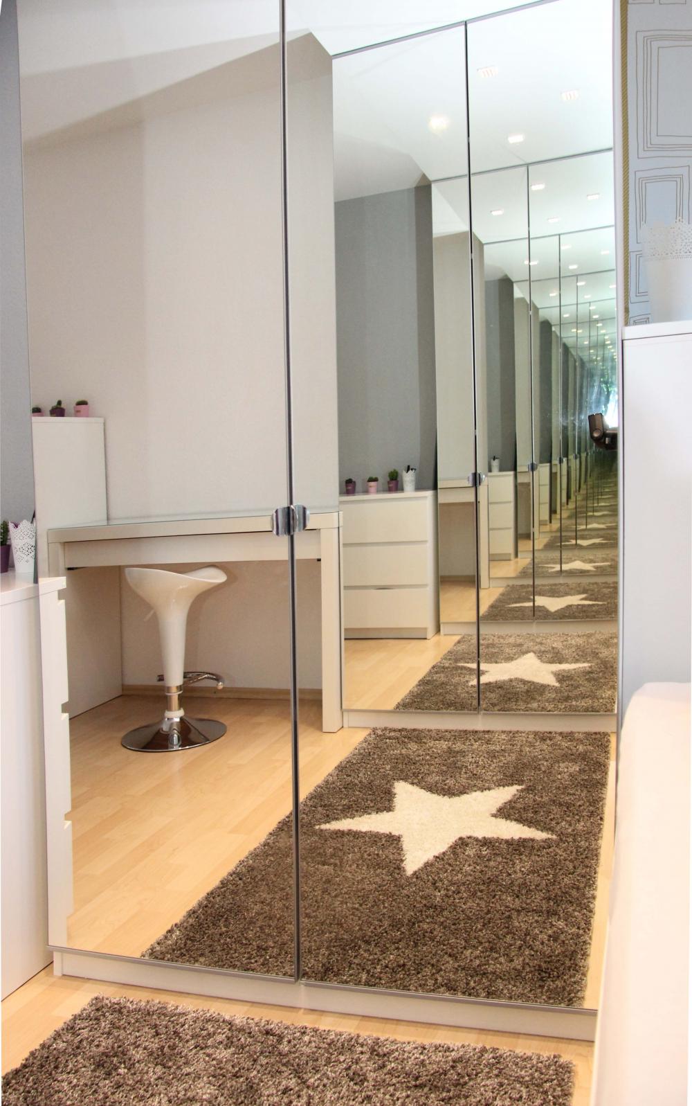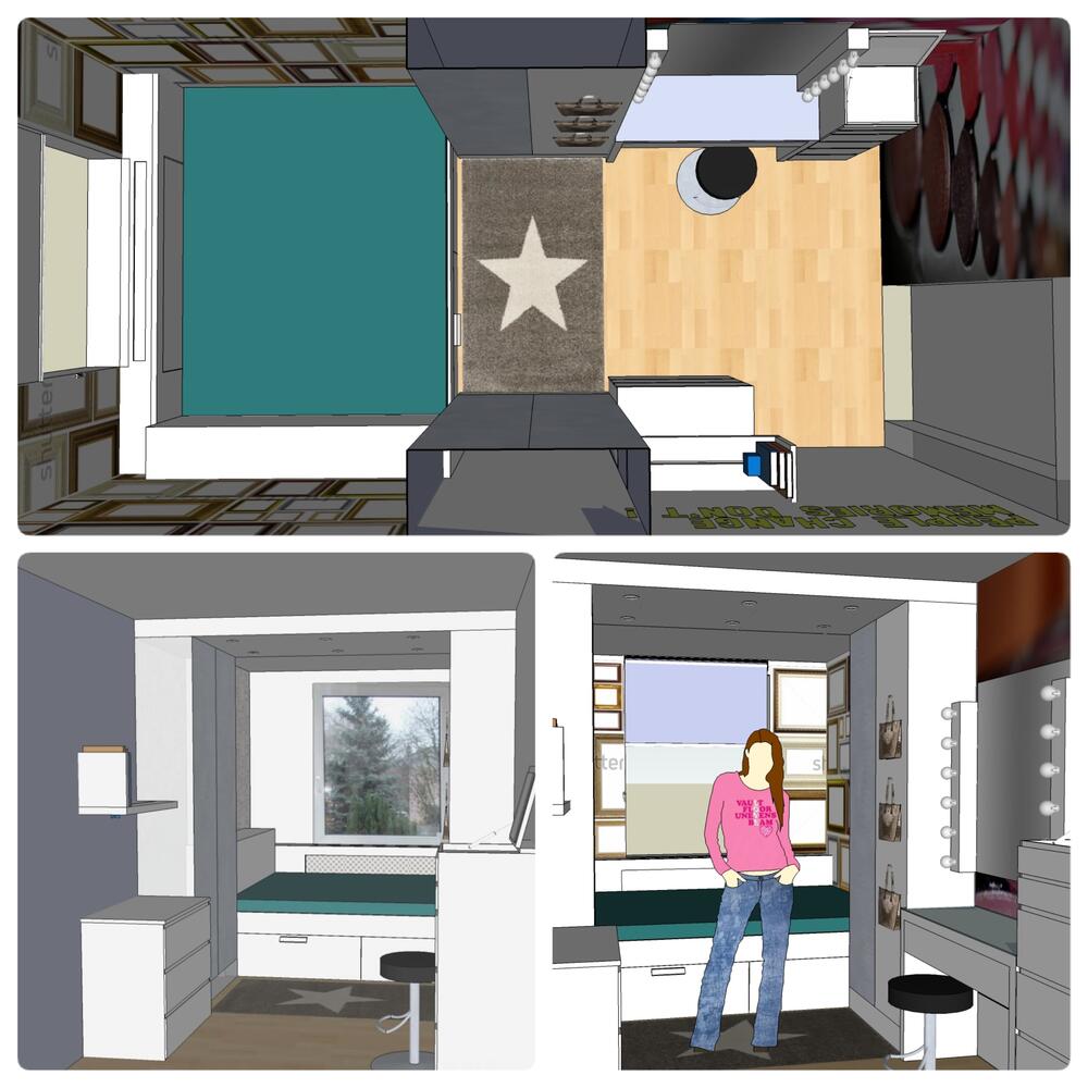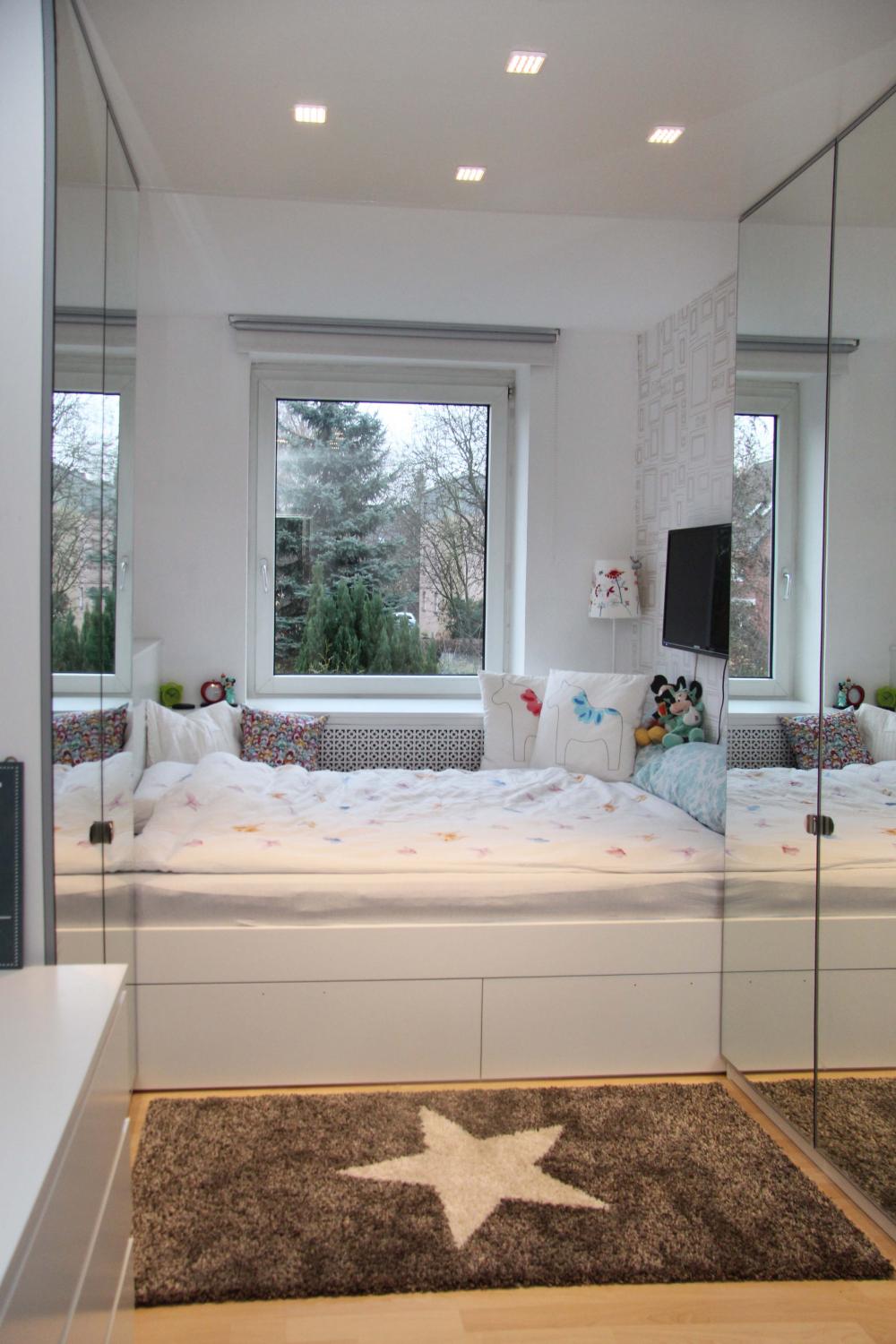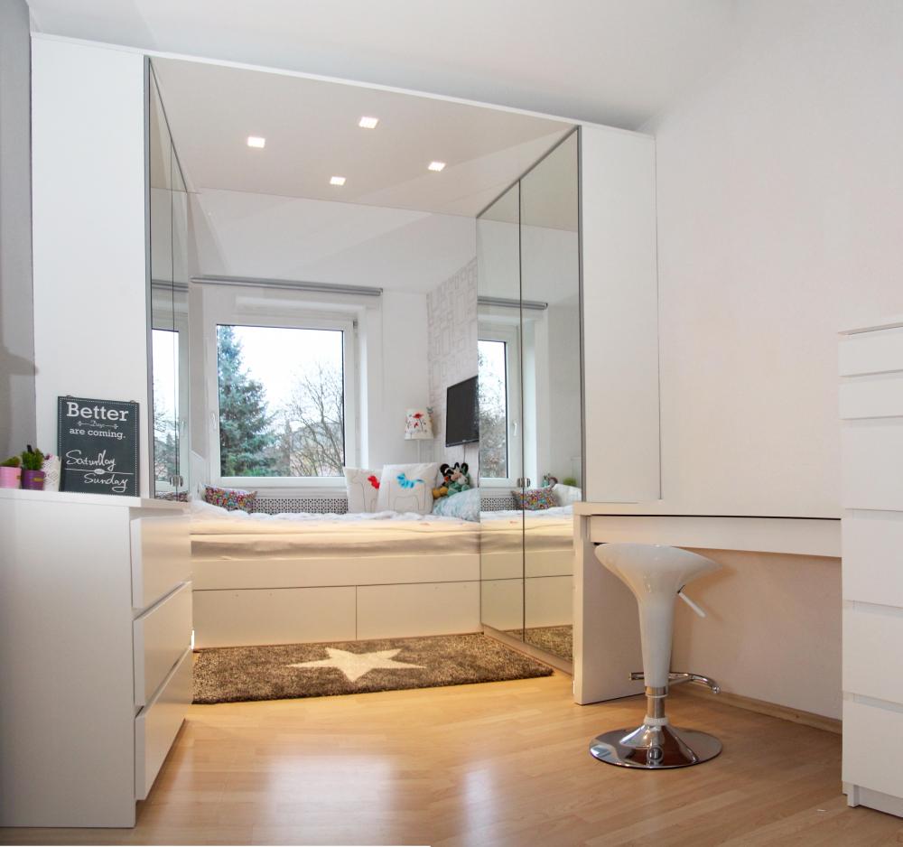 das kleine Zimmer zonieren wir mit zwei mittig platzierten Spiegelschränken, so entsteht eine optisch getrennte große Chill-Bettzone am Fenster, davor der mini „begehbarer“ Kleiderschrank mit Spiegeltüren, auf diese Weise ergibt sich nicht nur ein toller Endloseffekt auch lassen diese den Raum größer wirken. Mit einem kleinen Schreibtisch davor finden der Schulbereich seinen Platz.