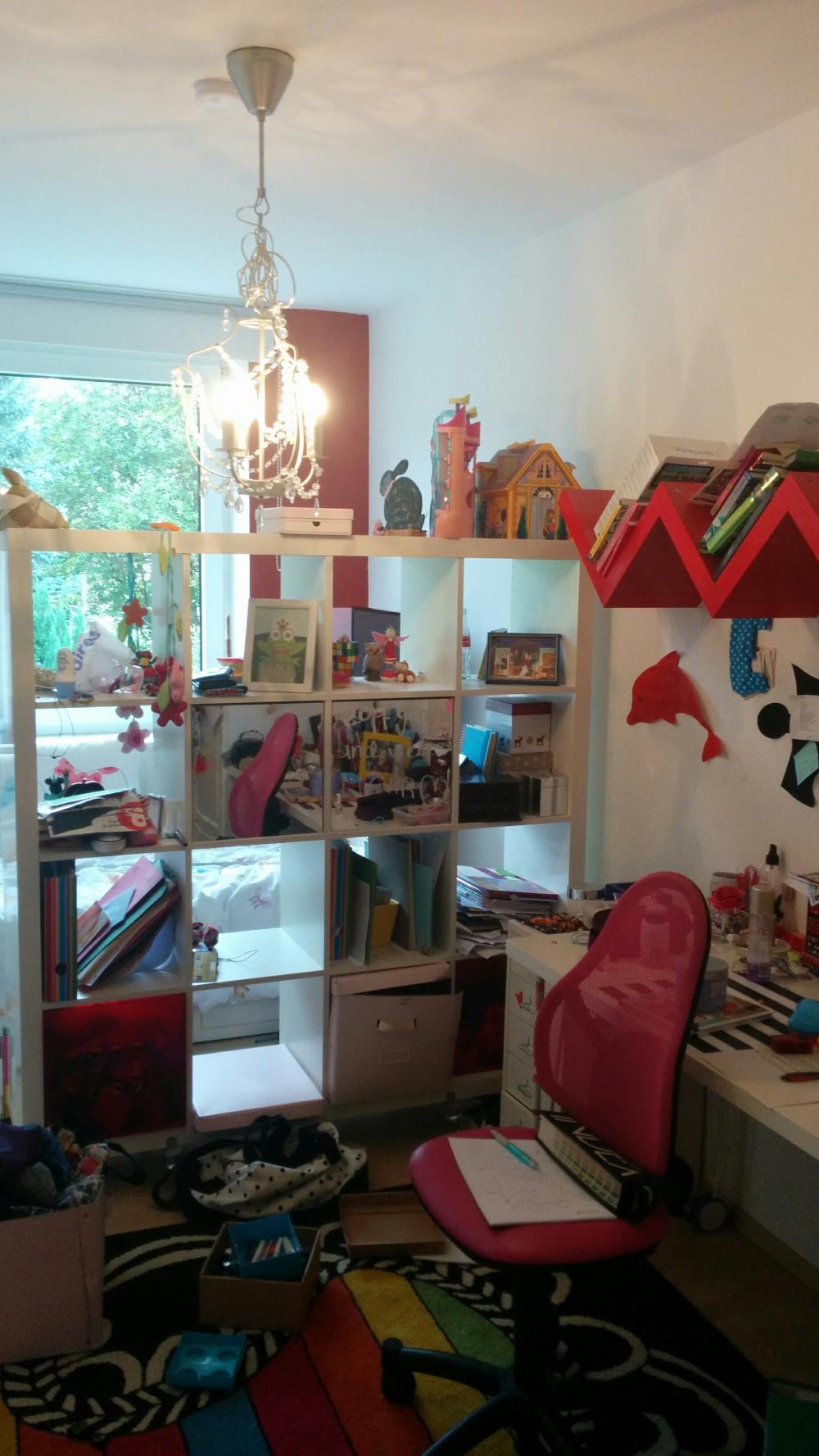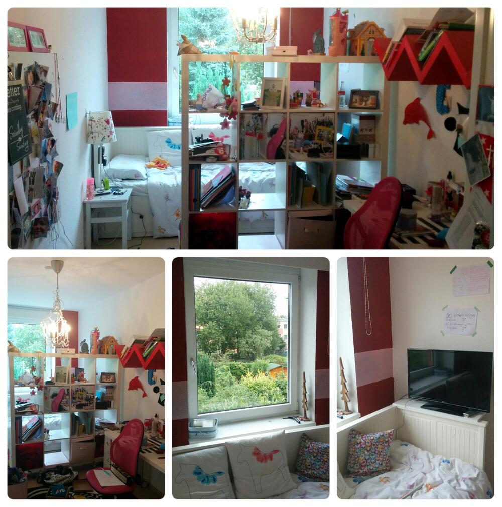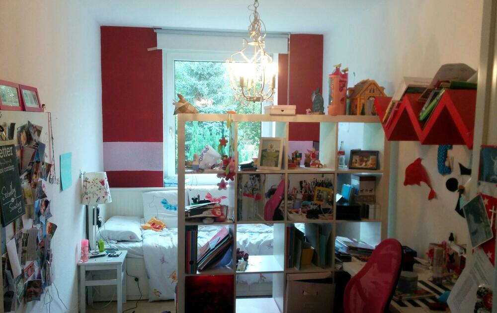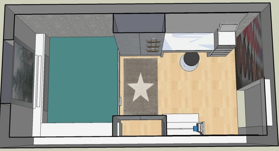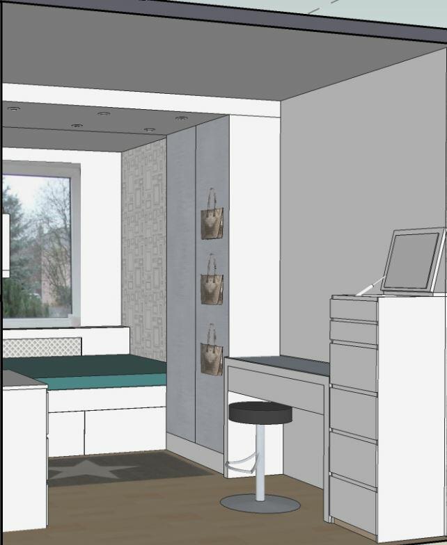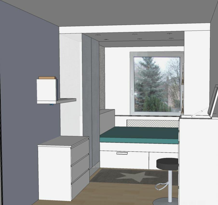 das kleine Zimmer zonieren wir mit zwei mittig platzierten Spiegelschränken, so entsteht eine optisch getrennte große Chill-Bettzone am Fenster, davor der mini „begehbarer“ Kleiderschrank mit Spiegeltüren, auf diese Weise ergibt sich nicht nur ein toller Endloseffekt auch lassen diese den Raum größer wirken. Mit einem kleinen Schreibtisch davor finden der Schulbereich seinen Platz.