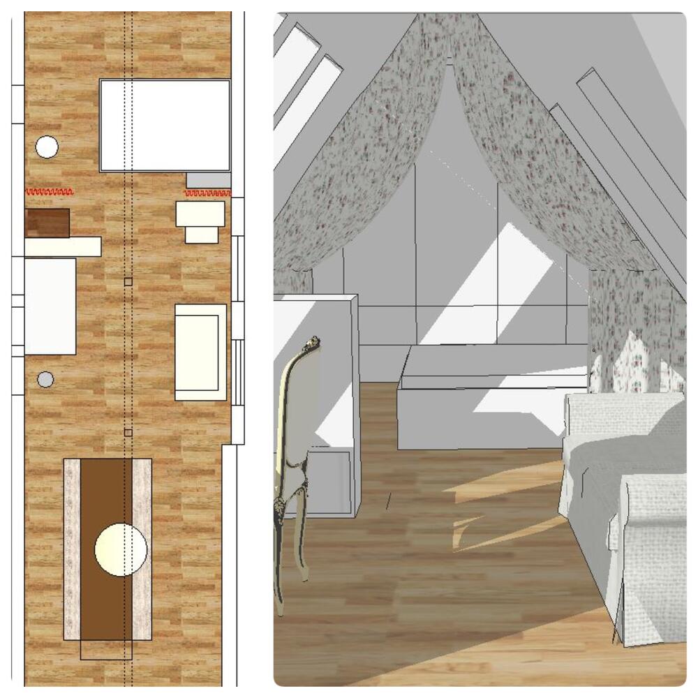 es braucht nicht viel um das tolle Dachgeschoss zu verwandeln, der Hingucker ein zweiteiliger Vorhang mit Rosenmotiv als Raumteiler, um den Schlafbereich vom restlichen Zimmer abzutrennen und schon füllt man sich wie eine Prinzessin.